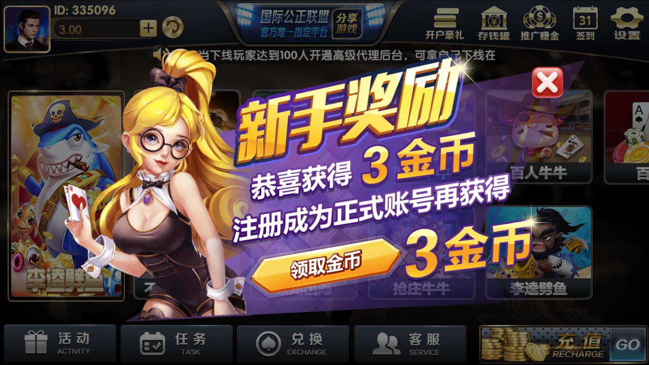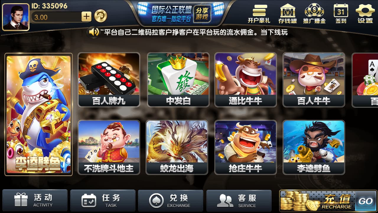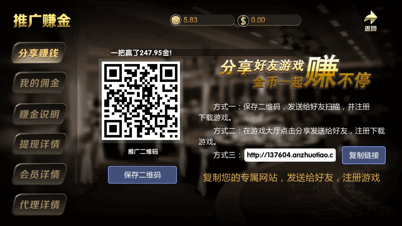 无限推广模式: 平台自动为每个玩家生成专属推广链接和二维码,实现无限级推广,玩家可以通过下级玩家的游戏流水获得提成。