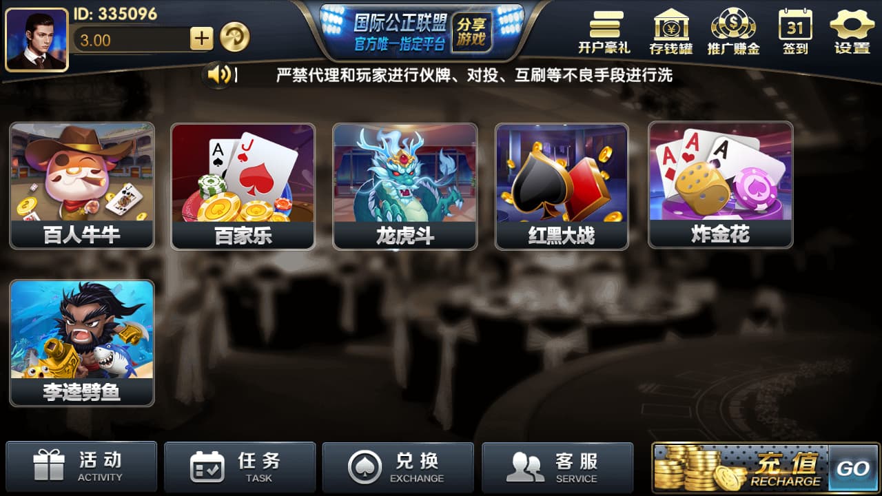 代理模式: 包括银商、充值抽成和抽水抽成三种模式,代理可以查看下级玩家的游戏情况和自身收益