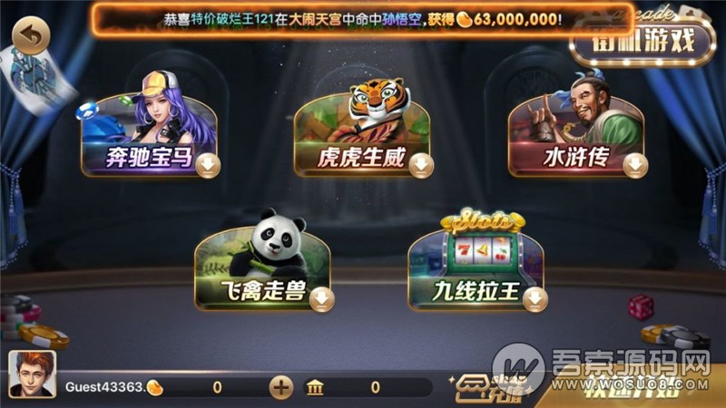 街机对战: 连环夺宝、豪车俱乐部、飞禽走兽、水浒传、九线拉王等。